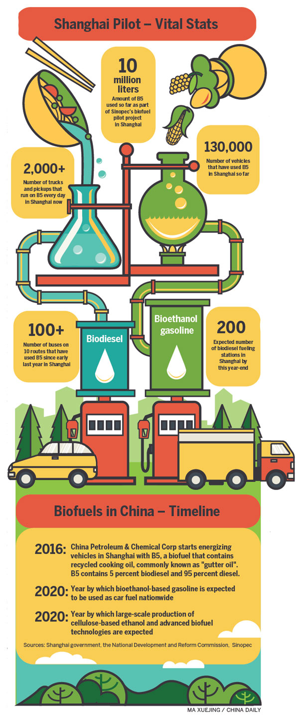 Besides expanding the station network, more specialized pumps will likely be built to facilitate use of biofuel in the future, Sinopec said. But such investments would depend on whether or not the Shanghai B5 pilot project is considered a total success.