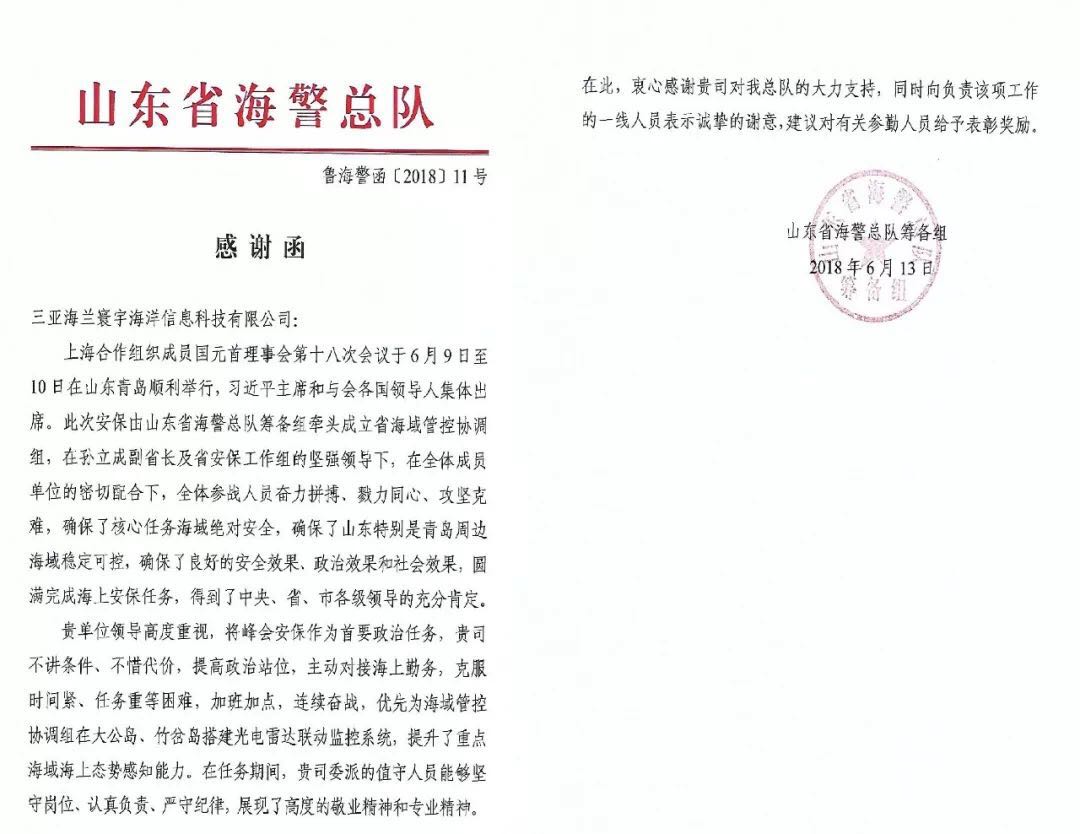 From June 9 to 11, the 2018 Shanghai Cooperation Organization Qingdao Summit was held in Qingdao. During the summit, Sanya Huanyu as an important participating unit assisted the Shandong Coast Police Corps to take on the “Sea Surface Security Monitoring Task in the Core Area” of the Summit and successfully completed the work of safety and security and made positive contributions to the successful convening of the Qingdao Summit.